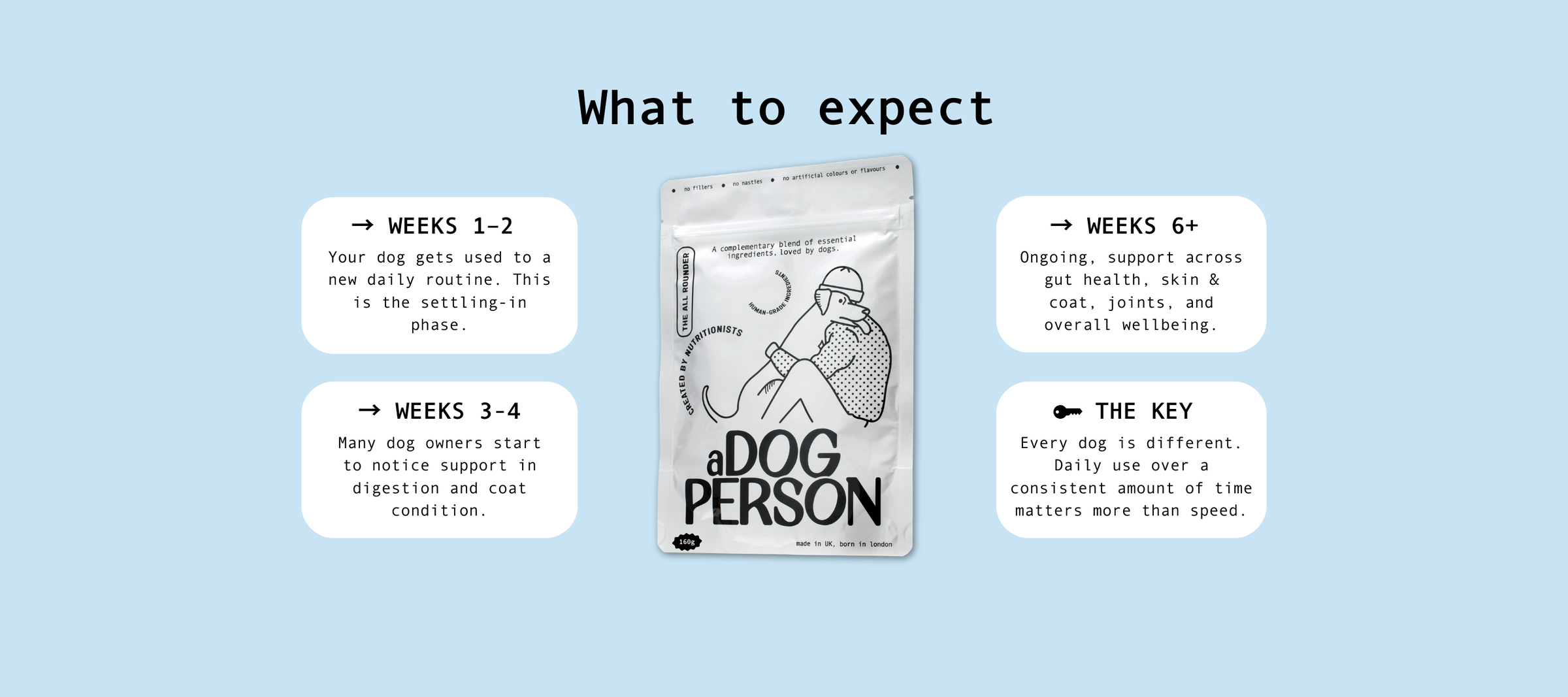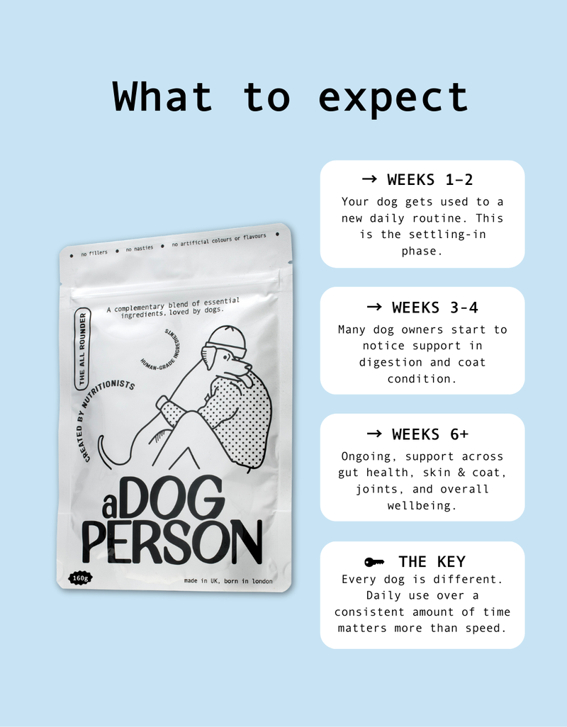 Some dog parents notice changes like better digestion or shinier coats within 2–4 weeks, but every dog is different. Think of The All Rounder as long-term support, not a quick fix.